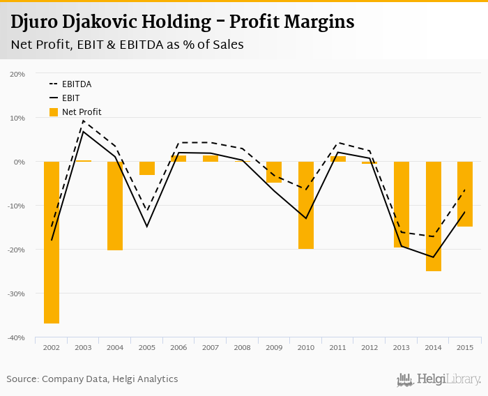 Djuro Djakovic Holding made a net profit of HRK -58.4 mil with revenues of HRK 396 mil in 2015, up by 38.6% and up by 3.74%, respectively, compared to the previous year.