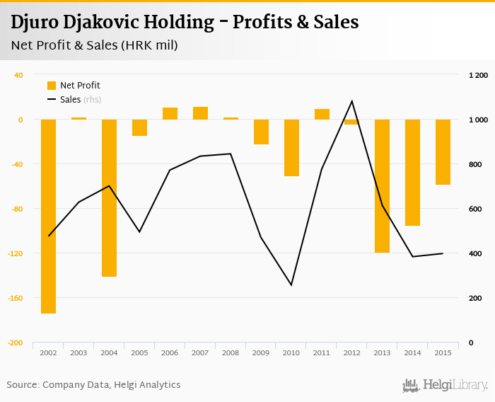 Djuro Djakovic Holding made a net profit of HRK -58.4 mil in 2015, up 38.6% compared to the previous year. Total sales reached HRK 396 mil, which is up 3.74% when compared to the previous year.