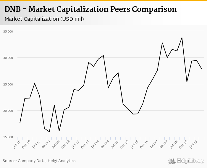 DNB stock traded at 160 per share at the end of third quarter of 2019 implying a market capitalization of USD 27,868 mil.