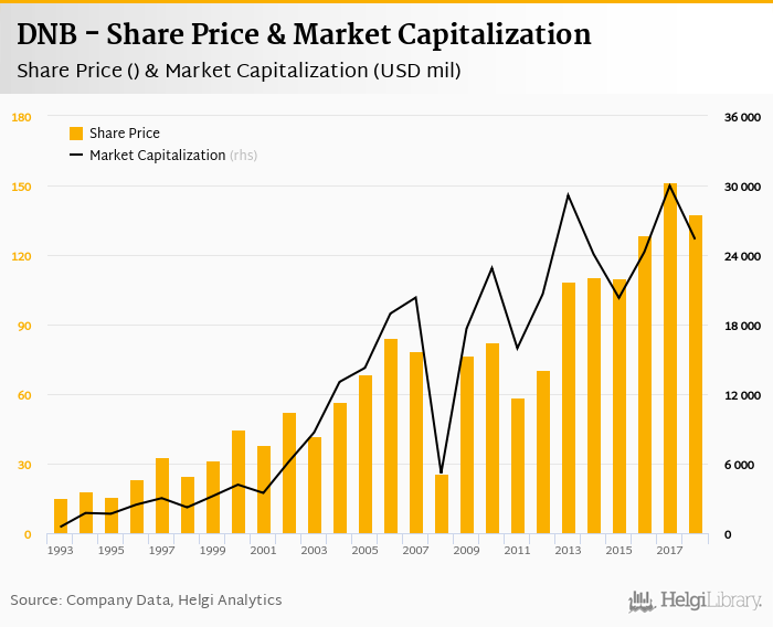 DNB stock traded at 138 per share at the end of 2018 implying a market capitalization of USD 25,346 mil.
