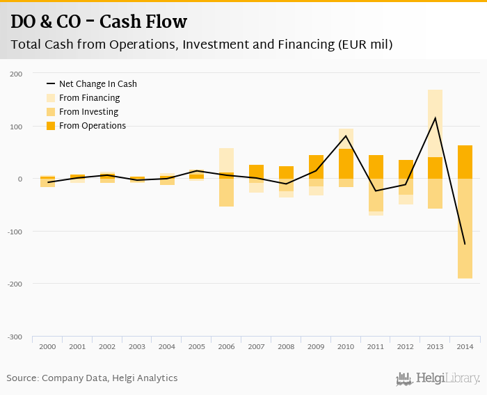 DO & CO's operating cash flow stood at EUR 64.3 mil in 2014, up 56% when compared to the previous year. Historically, between 2000 - 2014, the firm’s operating cash flow reached a high of EUR 64.3 mil in 2014 and a low of EUR 3.67 mil in 2000.