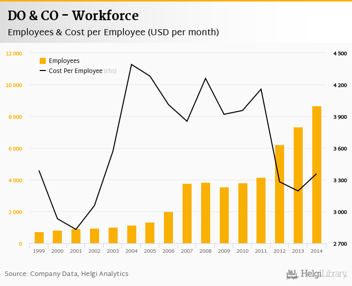 DO & CO employed 8,667 employees in 2014, up 18.4% compared to the previous year. Historically, between 1999 and 2014, the firm's workforce hit a high of 8,667 employees in 2014 and a low of 731 employees in 1999.