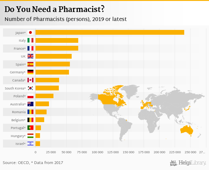 Based on a comparison of 26 countries in 2014, Japan ranked the highest in number of pharmacists with 205,716 persons followed by France and United Kingdom. On the other end of the scale was Iceland with 363 persons, Luxembourg with 380 persons and Estonia with 868 persons.