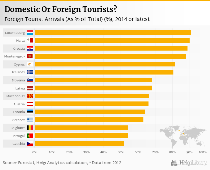 Based on a comparison of 33 countries in 2014, Luxembourg ranked the highest in foreign tourist arrivals as a percentage of total arrivals with 90.9% followed by Malta and Croatia. On the other end of the scale was United Kingdom with 20.9%, Sweden with 21.1% and Germany with 21.2%.