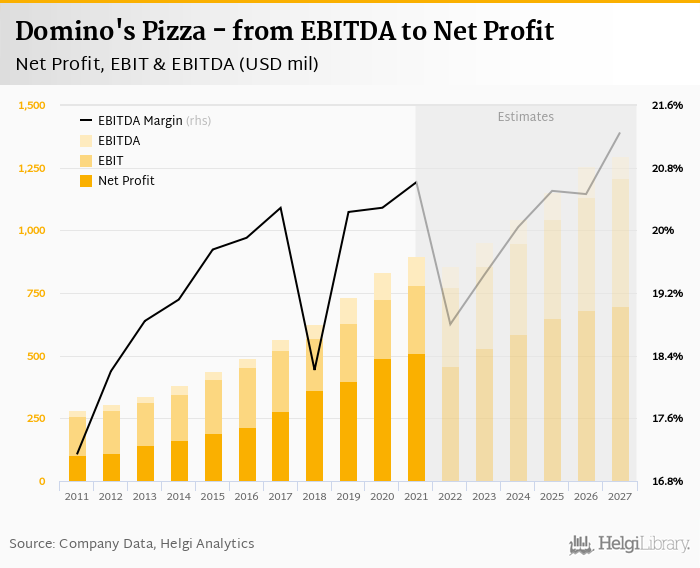 Domino's Pizza made a net profit of USD 510 mil with revenues of USD 4,357 mil in 2021, up by 3.9% and up by 5.83%, respectively, compared to the previous year. This translates into a net margin of 11.7%.