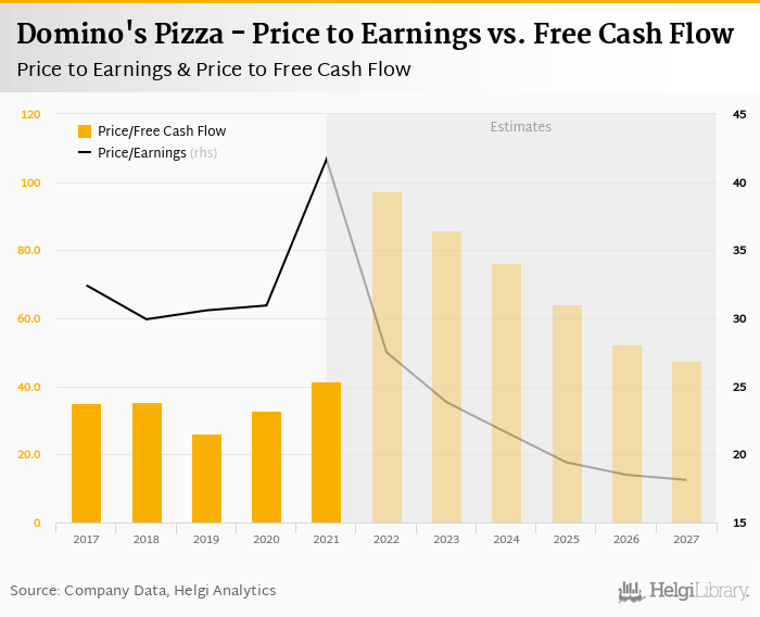 Regarding cash generated defined by the sum of net profit and depreciation, the stock traded at 38.0x at the end of 2021. When investments are excluded to get free cash flow, Domino's Pizza traded at 41.6x.