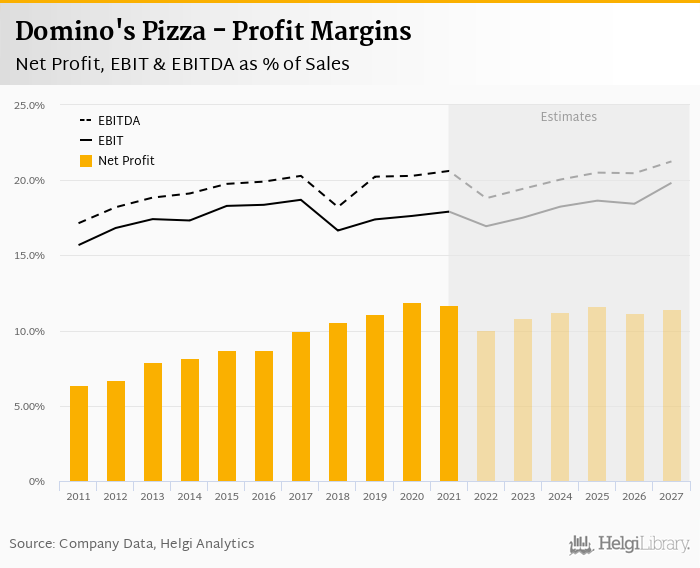 Domino's Pizza made a net profit of USD 510 mil with revenues of USD 4,357 mil in 2021, up by 3.90% and up by 5.83%, respectively, compared to the previous year.