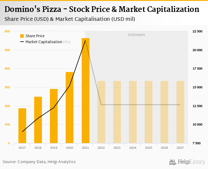 Domino's Pizza stock traded at USD 564 per share at the end 2021 implying a market capitalization of USD 21,270 mil.