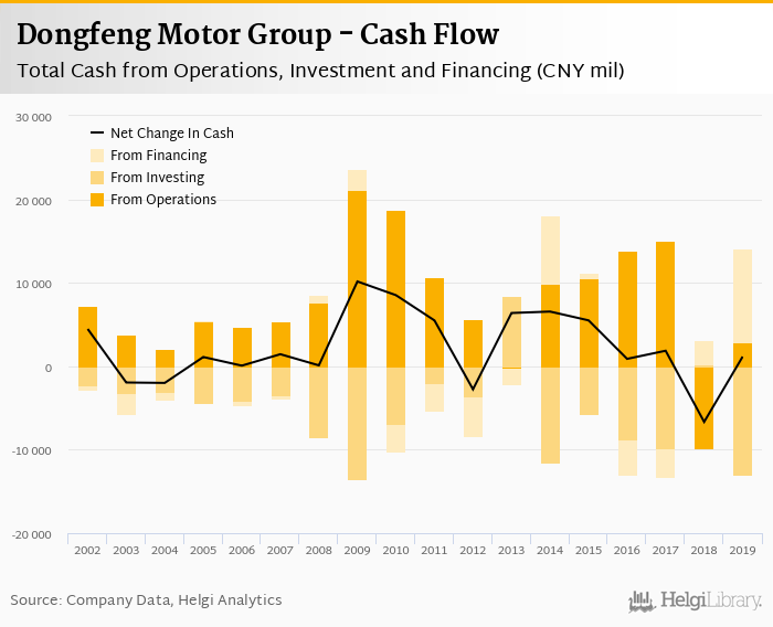 Dongfeng Motor Group's operating cash flow stood at CNY 2,857 mil in 2019, up 129% when compared to the previous year. Historically, between 2002 - 2019, the firm’s operating cash flow reached a high of CNY 21,162 mil in 2009 and a low of CNY -9,800 mil in 2018.