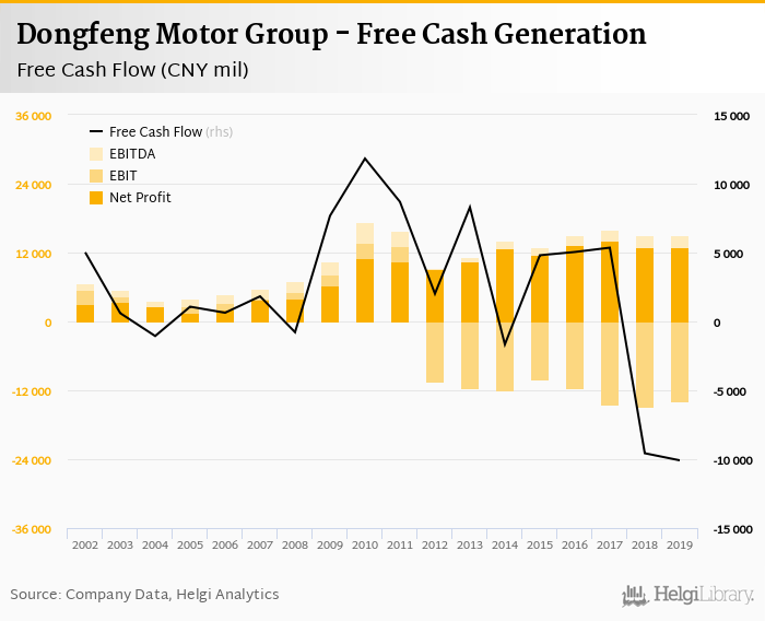 The company generated cash, defined by a sum of net profit and depreciation, of CNY 15,070 mil or 14.9% of sales. When investments are excluded, free cash flow reached CNY -10,083 mil, or -9.97% of sales in 2019.