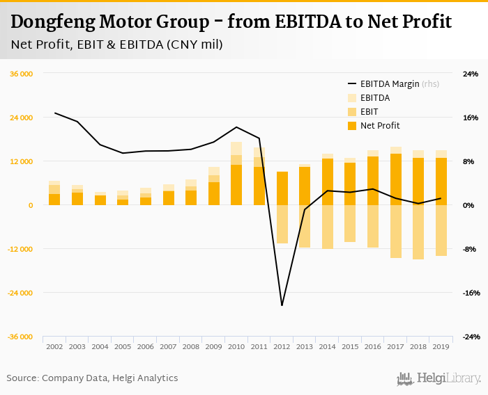 Dongfeng Motor Group made a net profit of CNY 12,858 mil with revenues of CNY 101,087 mil in 2019, down by 0.932% and down by 3.31%, respectively, compared to the previous year. This translates into a net margin of 12.7%.