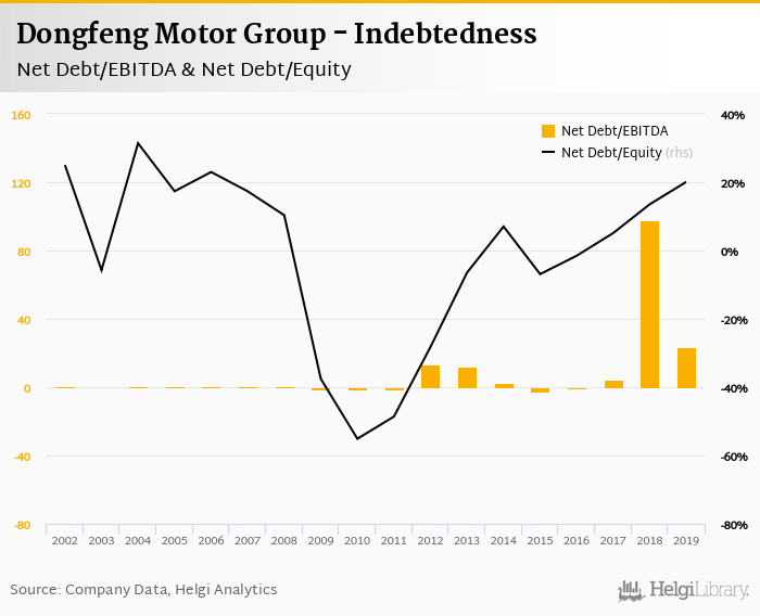 Dongfeng Motor Group's net debt stood at CNY 26,919 mil and accounted for 20.1% of equity at the end of 2019. The ratio is up 6.55 pp compared to the previous year.