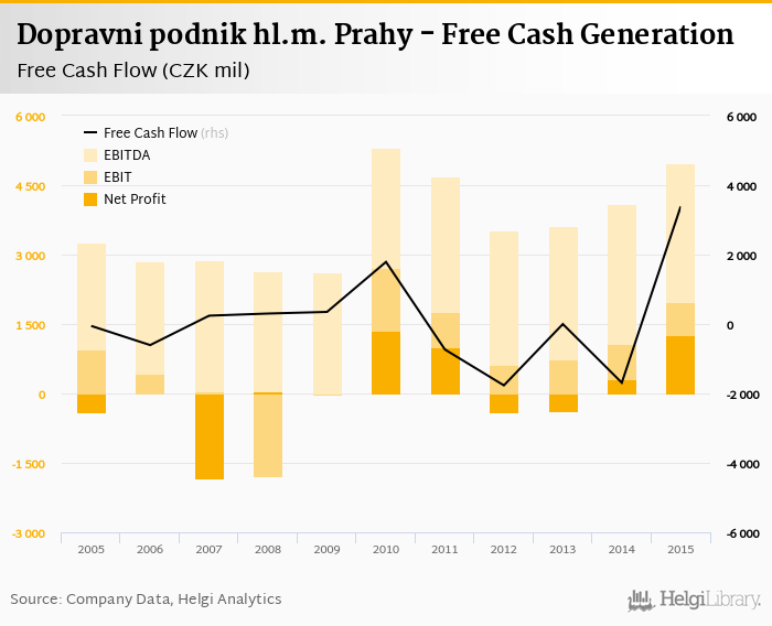 Dopravni podnik hl.m. Prahy made a net profit of CZK 1,255 mil with revenues of CZK 18,094 mil in 2015, up by 297% and up by 6.77%, respectively, compared to the previous year. This translates into a net margin of 6.94%.