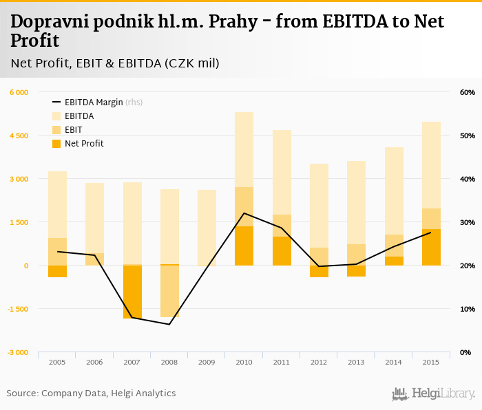 Dopravni podnik hl.m. Prahy made a net profit of CZK 1,255 mil with revenues of CZK 18,094 mil in 2015, up by 297% and up by 6.77%, respectively, compared to the previous year. This translates into a net margin of 6.94%.