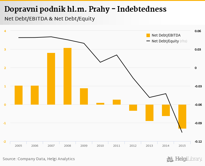 Dopravni podnik hl.m. Prahy's net debt stood at CZK -6,485 mil and accounted for -0.106 of equity at the end of 2015. The ratio is down 0.064 pp compared to the previous year.