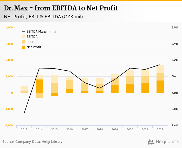 Dr.Max made a net profit of CZK 762 mil with revenues of CZK 24,796 mil in 2022, up by 31.7% and up by 9.88%, respectively, compared to the previous year. This translates into a net margin of 3.07%.