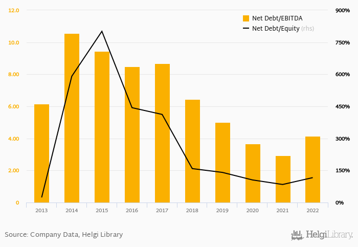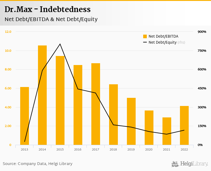 Dr.Max's net debt stood at CZK 7,055 mil and accounted for 117% of equity at the end of 2022. The ratio is up 32.2 pp compared to the previous year.