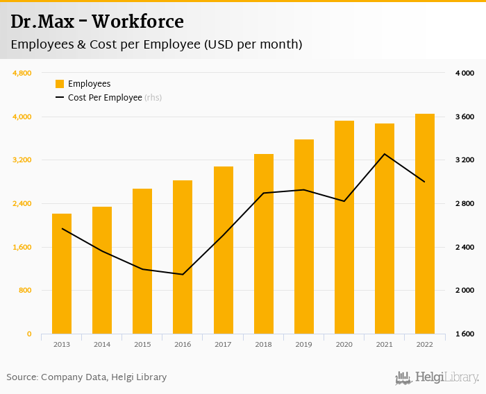 Dr.Max employed 4,063 employees in 2022, up 4.53% compared to the previous year. Historically, between 2013 and 2022, the firm's workforce hit a high of 4,063 employees in 2022 and a low of 2,221 employees in 2013.