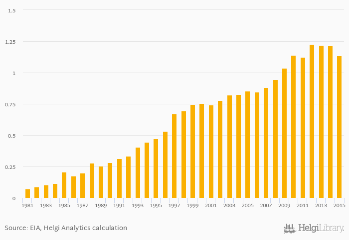 Historically, dry natural gas production as a share of worldwide production in Thailand reached an all time high of 1.23% in 2012 and an all time low of 0.073% in 1981.