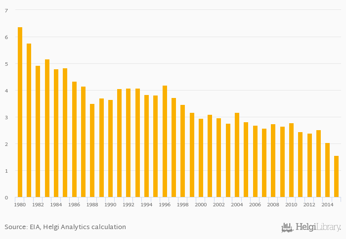 Dry natural gas production as a share of worldwide production fell 23.2% to 1.56% in Netherlands in 2015, according to EIA.