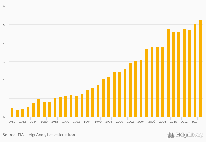 Dry natural gas production as a share of worldwide production rose 4.38% to 5.26% in Iran in 2015, according to EIA.