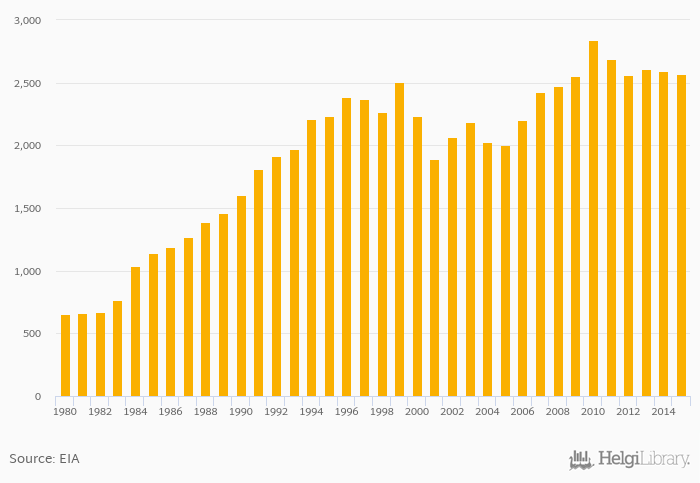 Dry natural gas production fell 0.885% to 2,571 bil cb ft in Indonesia in 2015, according to EIA.