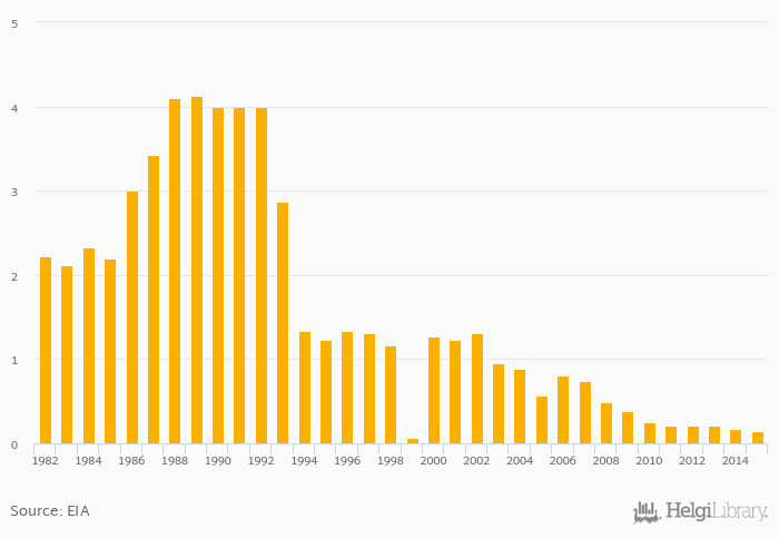 Dry natural gas production fell 20.0% to 0.141 bil cb ft in Greece in 2015, according to EIA.