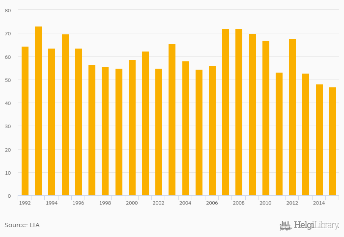 Dry natural gas production fell 2.79% to 46.8 bil cb ft in Croatia in 2015, according to EIA.