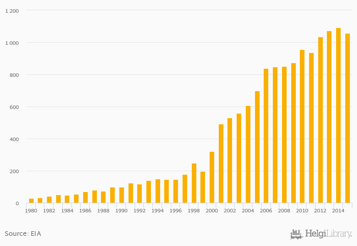 Historically, dry natural gas production in Oman reached an all time high of 1,091 bil cb ft in 2014 and an all time low of 28.0 bil cb ft in 1980. When compared to Oman's main peers, dry natural gas production in Iran amounted to 6,526 bil cb ft, 3,614 bil cb ft in Saudi Arabia, 2,125 bil cb ft in United Arab Emirates and 101 bil cb ft in Yemen in 2015.