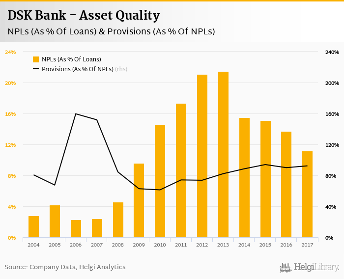 DSK Bank's non-performing loans reached 11.2% of total loans at the end of 2017, down from 13.7% compared to the previous year. Historically, the NPL ratio hit an all time high of 21.5% in 2013 and an all time low of 2.27% in 2006.
