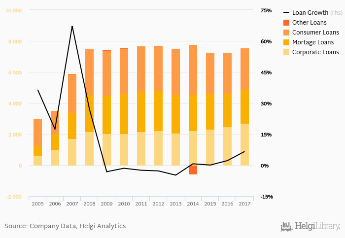 Mortgage loans represented 28.2% of the bank's loan book at the end of the year 2017, consumer further 36.0% and corporate loans 35.9% of total loans.