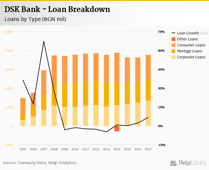 DSK Bank's loans reached BGN 7,564 mil in the 2017, up from BGN 7,260 mil compared to the previous year. Historically, the bank’s loans reached an all time high of BGN 7,707 mil in 2012 and an all time low of BGN 2,977 mil in 2005.