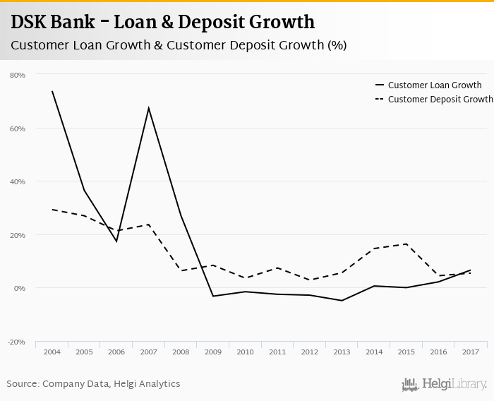 DSK Bank's customer loan growth reached 6.59% in 2017, up from 2.17% compared to the previous year. Historically, the bank’s loans growth reached an all time high of 73.7% in 2004 and an all time low of -4.87% in 2013. In the last decade, the average annual loan growth amounted to 1.80%.