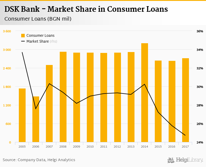 DSK Bank accounted for 24.7% of all consumer loans issued in Bulgaria at the end of 2017. Historically, the bank’s market share in consumer loans reached an all time high of 33.7% in 2005 and an all time low of 24.7% in 2017.