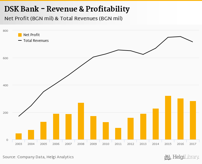 DSK Bank made a net profit of BGN 285 mil under revenues of BGN 715 mil in 2017, up -6.03% and -5.28% respectively compared to the previous year.