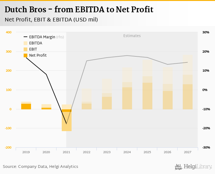 Dutch Bros made a net profit of USD -12.9 mil with revenues of USD 498 mil in 2021, down by 326% and up by 52.1%, respectively, compared to the previous year. This translates into a net margin of -2.59%.