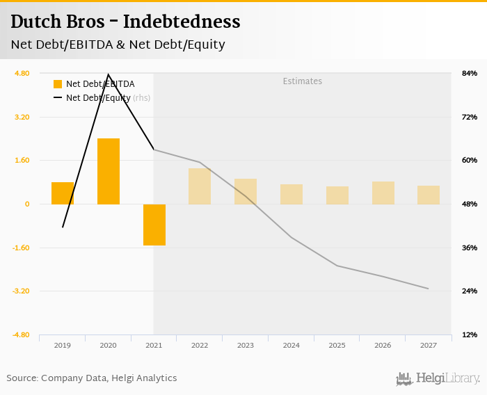 Dutch Bros's net debt stood at USD 132 mil and accounted for 62.9% of equity at the end of 2021. The ratio is down 20.7 pp compared to the previous year.