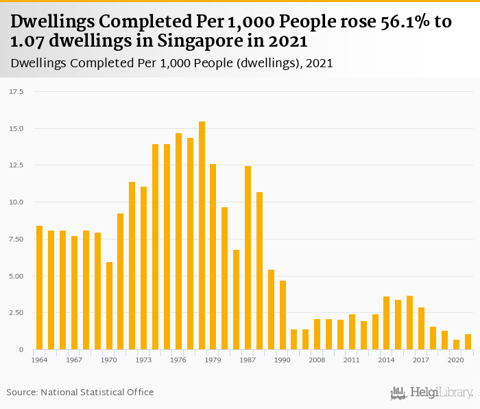 Historically, dwellings completed per 1,000 people in Singapore reached an all time high of 15.5 dwellings in 1978 and an all time low of 0.686 dwellings in 2020.