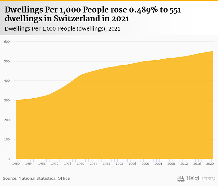 Dwellings per 1,000 people rose 0.489% to 551 dwellings in Switzerland in 2021, according to the National Statistical Office.