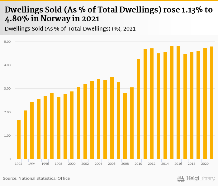 Dwellings sold as a percentage of all dwellings rose 1.13% to 4.80% in Norway in 2021, according to the National Statistical Office.