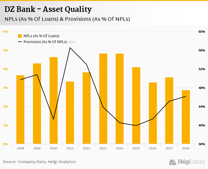 DZ Bank's non-performing loans reached 2.87% of total loans at the end of 2018, down from 3.56% compared to the previous year. Historically, the NPL ratio hit an all time high of 4.83% in 2013 and an all time low of 2.87% in 2018.