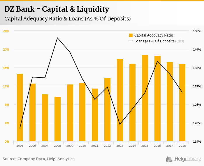 DZ Bank's capital adequacy ratio reached 16.8% at the end of 2018, down from 17.2% compared to the previous year. Historically, the bank’s capital ratio hit an all time high of 18.8% in 2015 and an all time low of 9.70% in 2008.