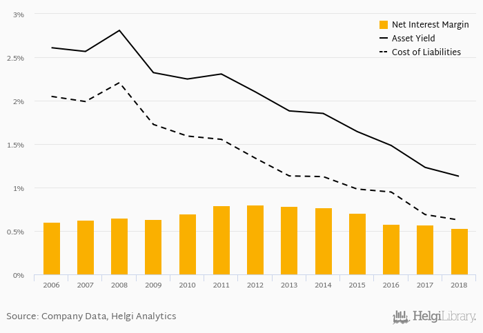Historically, the bank’s net interest margin reached an all time high of 0.802% in 2012 and an all time low of 0.532% in 2018. The average margin in the last five years amounted to 0.634%.