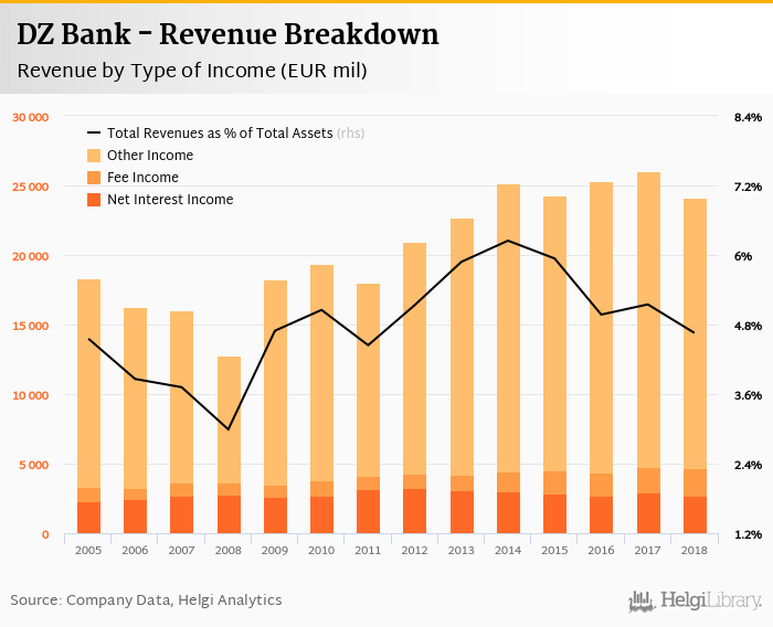 DZ Bank generated total banking revenues of EUR 24,144 mil in 2018, down 7.22% compared to the previous year.