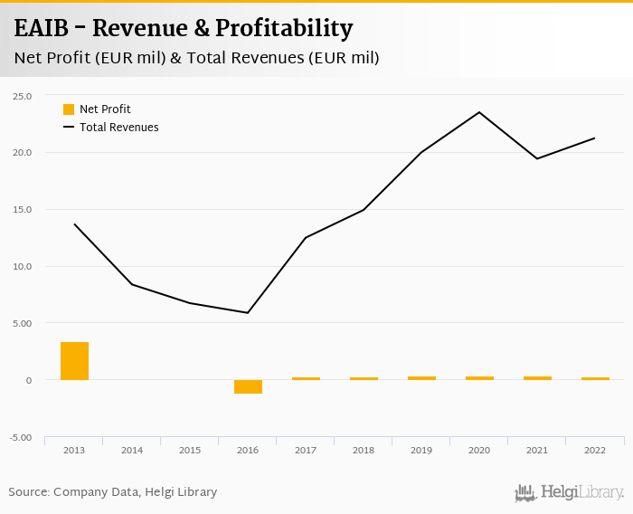EAIB made a net profit of EUR 0.273 mil under revenues of EUR 21.2 mil in 2022, up -12.7% and 9.41% respectively compared to the previous year.