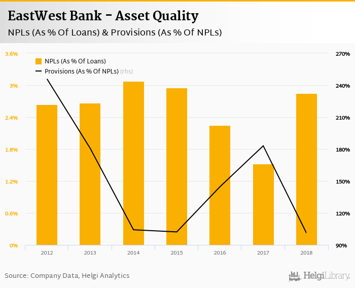 EastWest Bank's non-performing loans reached 2.85% of total loans at the end of 2018, up from 1.53% compared to the previous year. Historically, the NPL ratio hit an all time high of 3.08% in 2014 and an all time low of 1.53% in 2017.