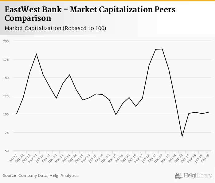 EastWest Bank stock traded at PHP 11.9 per share at the end of third quarter of 2019 implying a market capitalization of USD 518 mil.