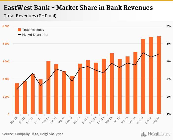 As a result, EastWest Bank accounted for 4.40% of all bank revenues generated by banks in Philippines in 2016-09-30. Historically, the bank’s market share in total revenues reached an all time high of 4.48% in 2016-03-31 and an all time low of 2.38% in 2012-03-31.