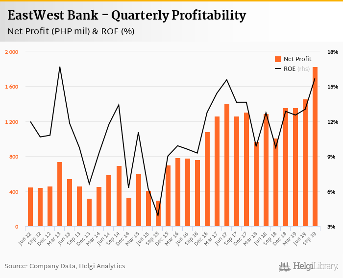 EastWest Bank made a net profit of PHP 1,826 mil in the third quarter of 2019, up 81.1% when compared to the same period of last year. This implies a return on equity of 15.7%.