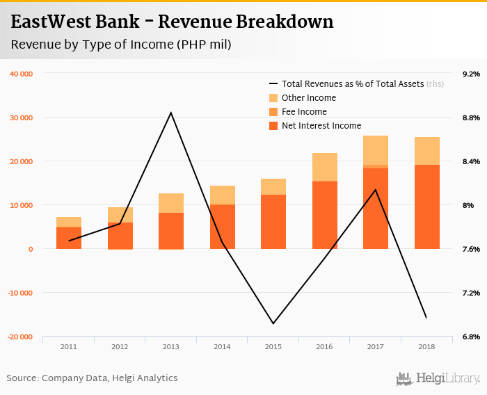 EastWest Bank generated total banking revenues of PHP 25,571 mil in 2018, down 1.02% compared to the previous year.